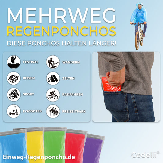 Ob biologisch abbaubar oder aus robustem Kunststoff – unsere Ponchos sind die langlebigere und nachhaltigere Alternative zu dünnen, schnell reißenden Modellen.
